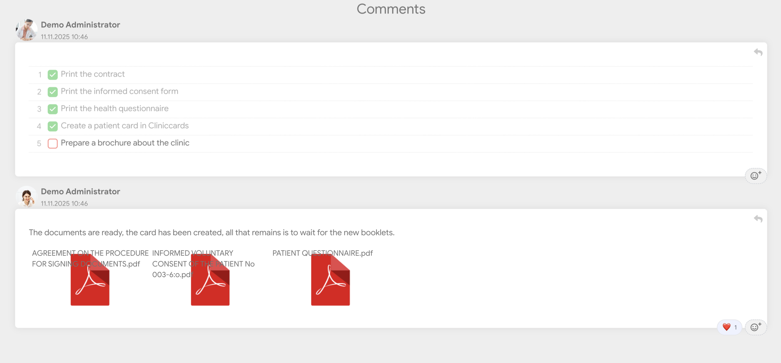 These boards are test boards, as are all the tasks and comments on them. They are designed to demonstrate how working with Tasks might look in a real clinic.