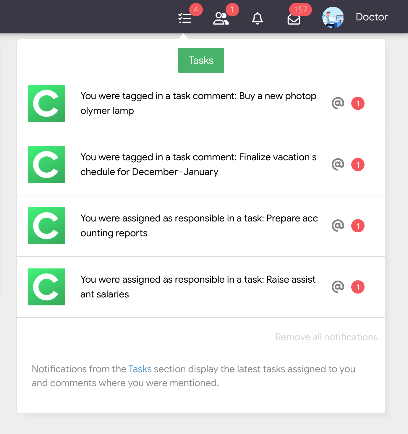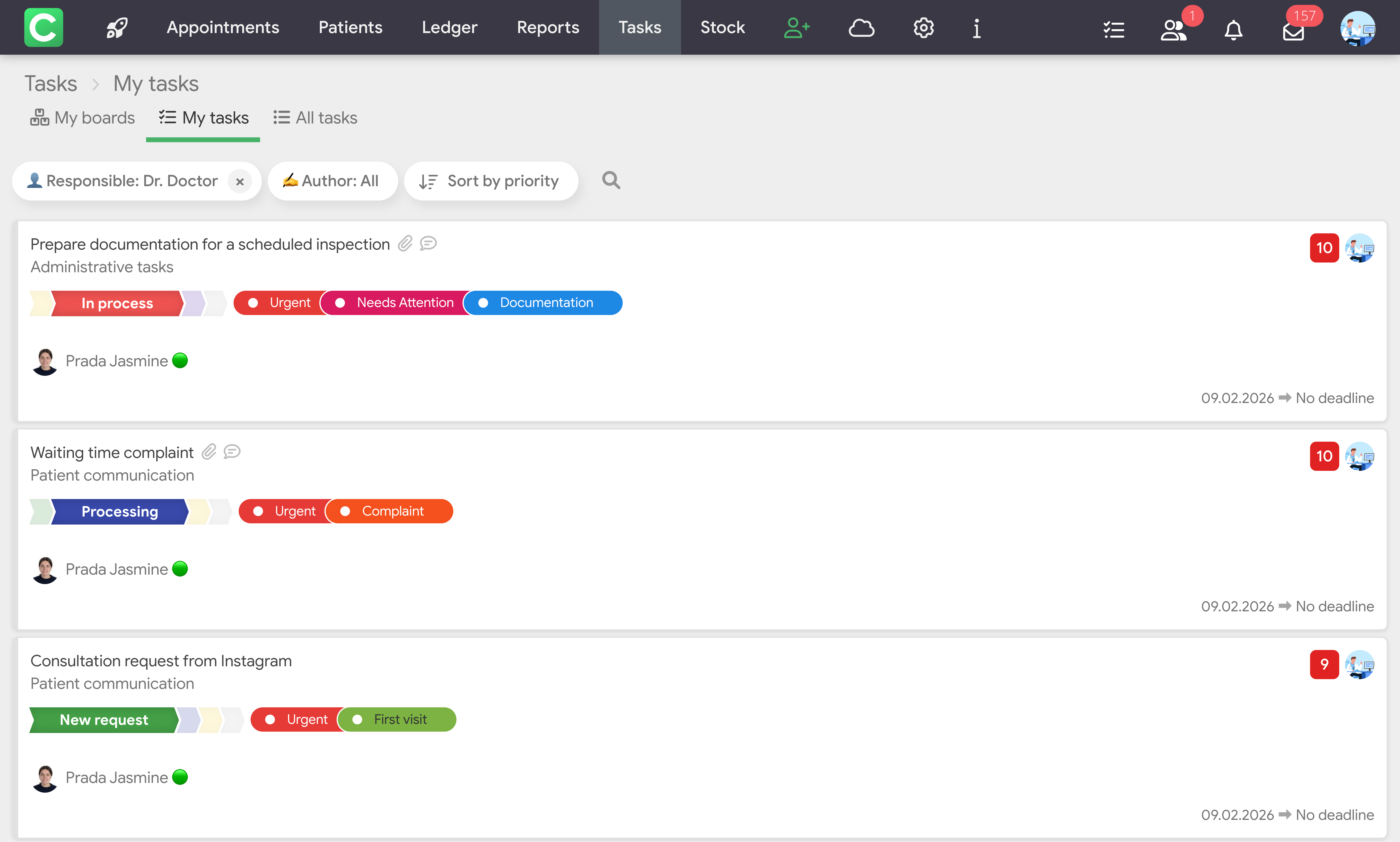 Important: notifications from all clinics in which the user is a member and where the Tasks module is activated are displayed here. That is, if you work with several clinics, all notifications from their tasks are collected in one place.