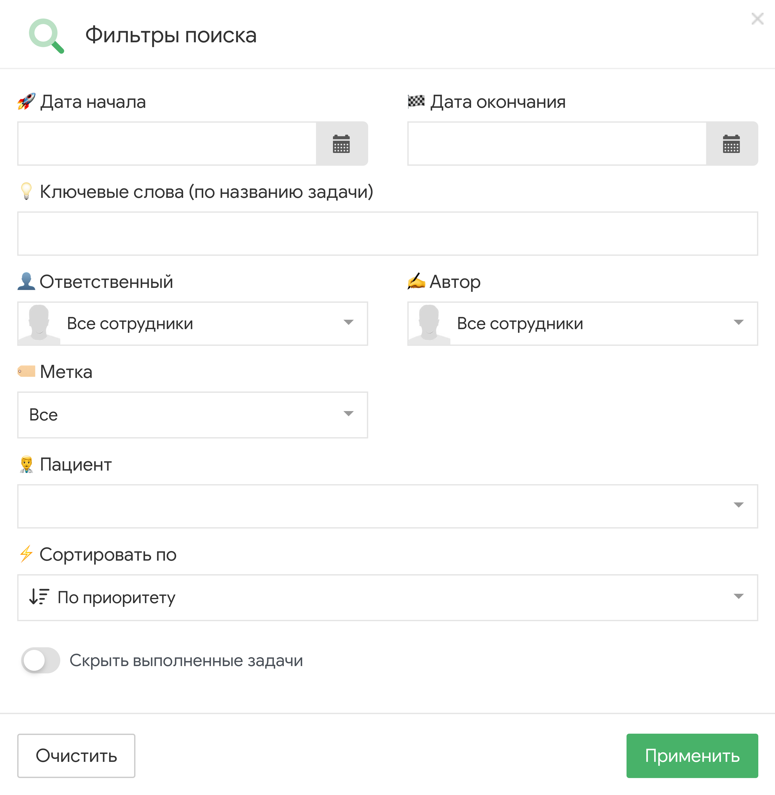 Результаты можно сортировать по приоритету (от высокого к низкому), дате создания и дате начала/завершения.