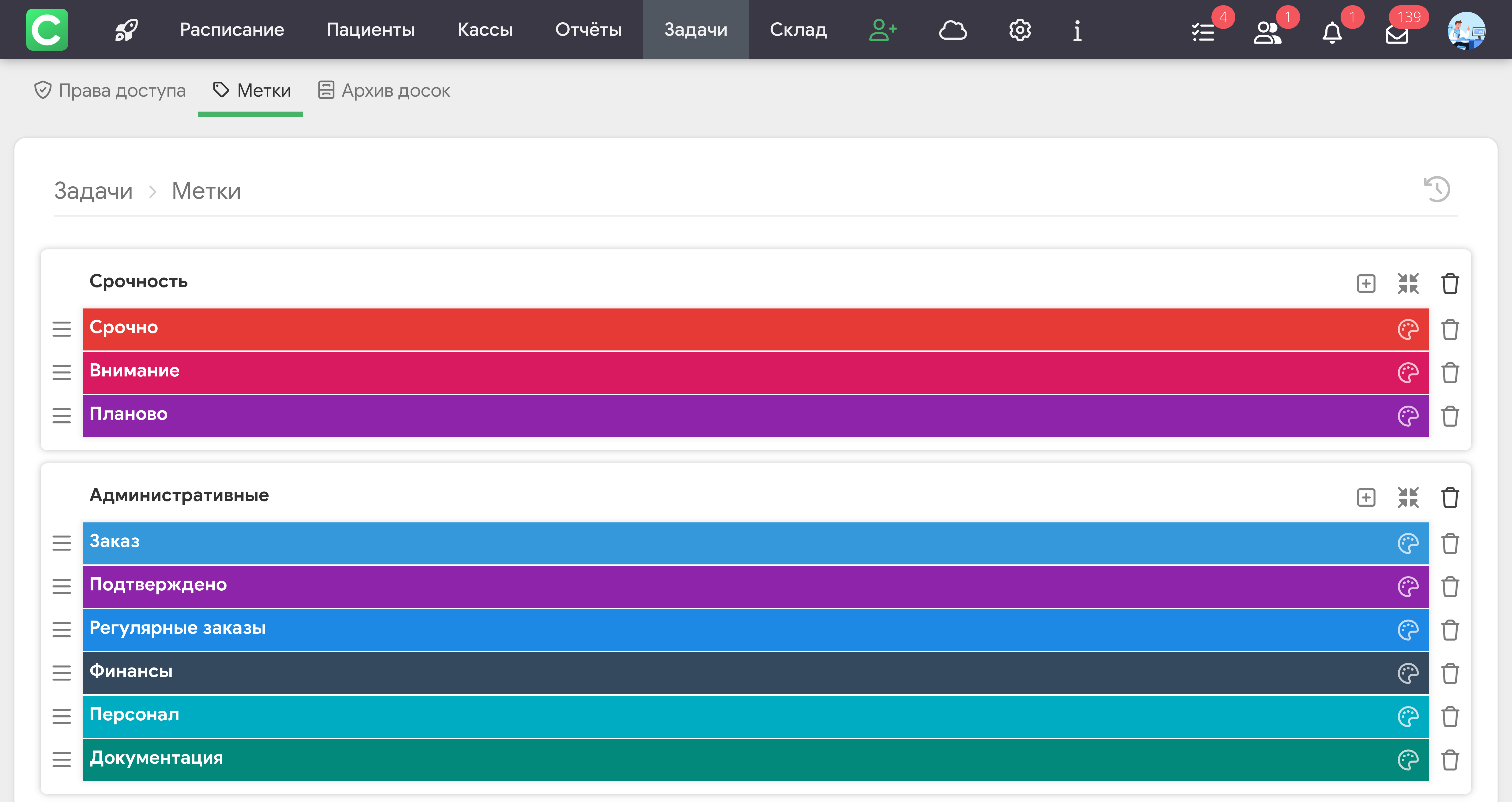 По категориям – метки, пациент, приоритет;