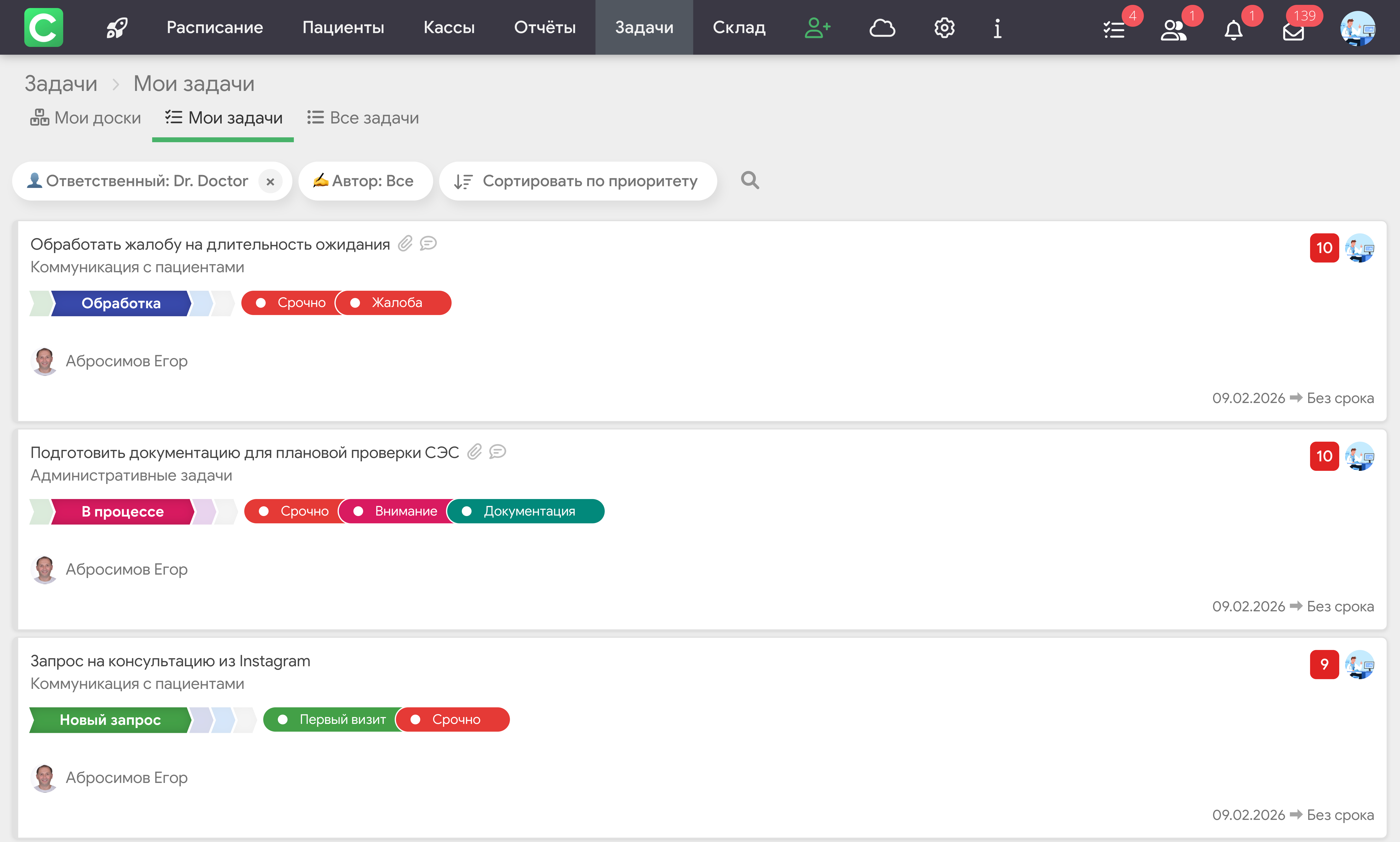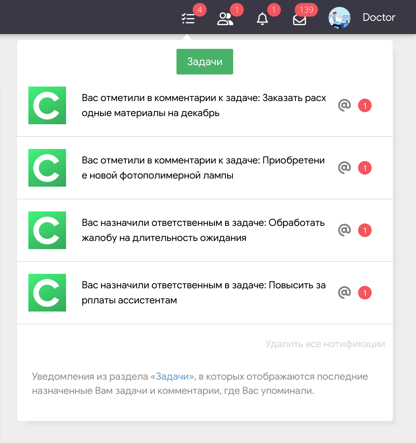 Важно: здесь отображаются уведомления из всех клиник, в которых пользователь является участником и где активирован модуль Задачи. То есть, если вы работаете с несколькими клиниками – все сообщения из их задач собираются в одном месте.