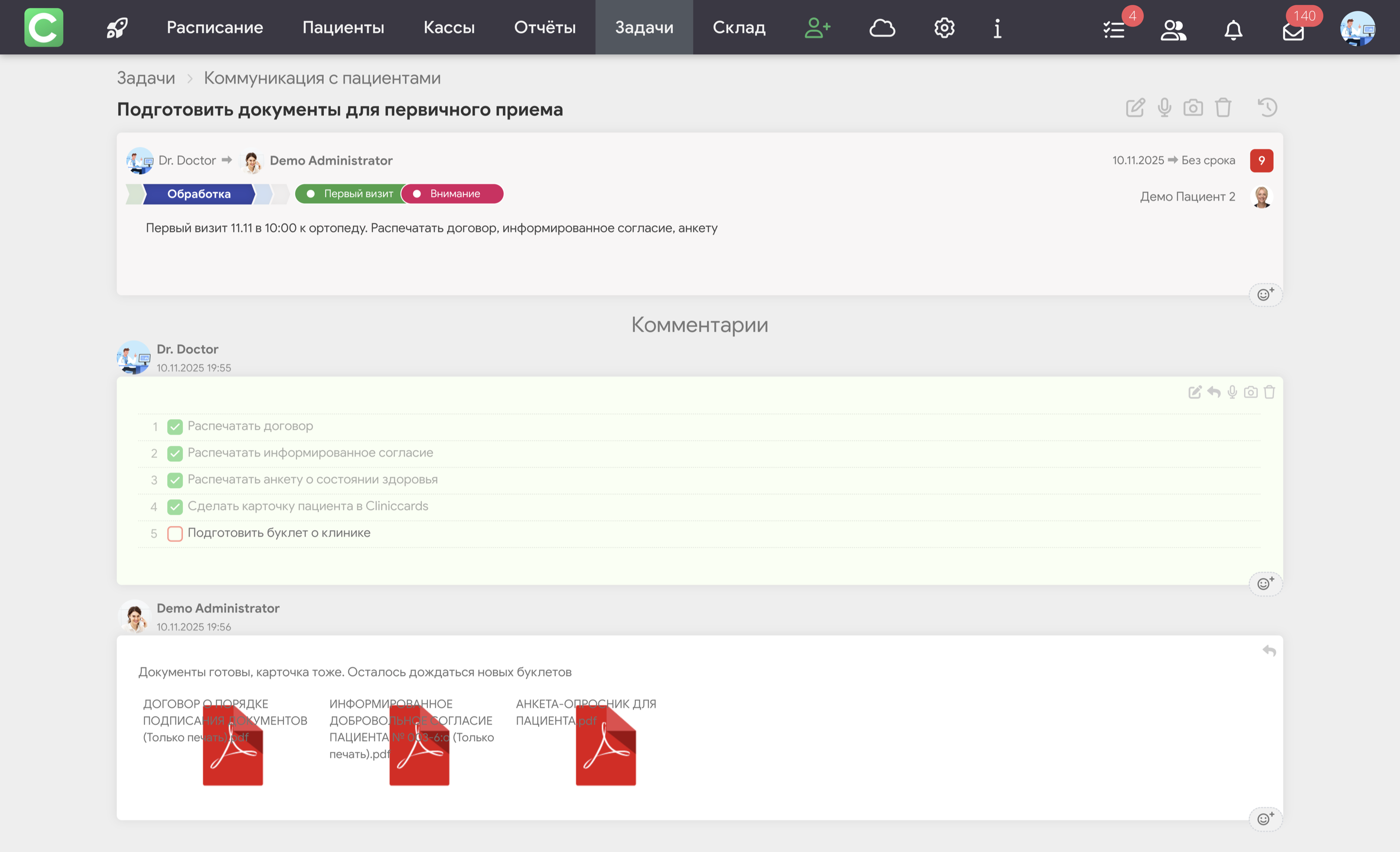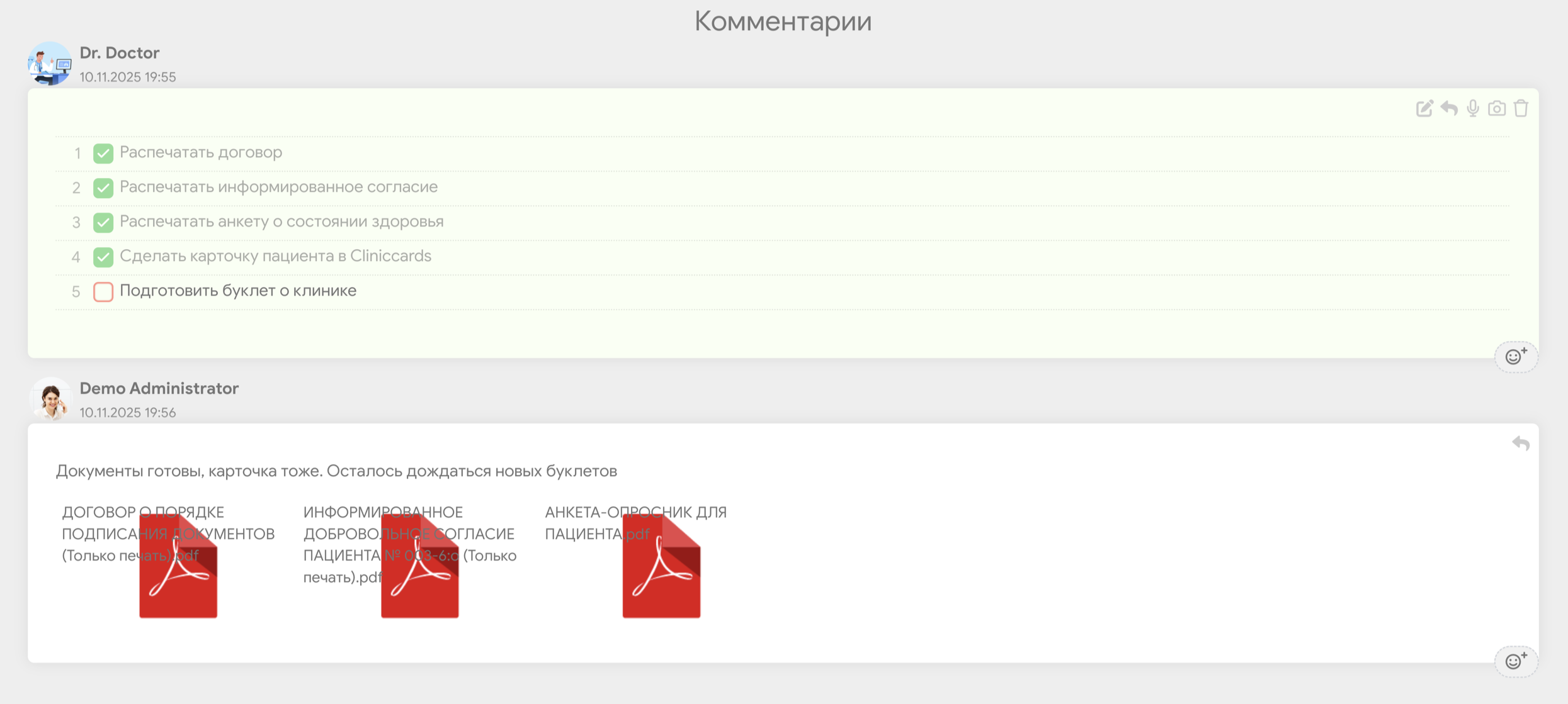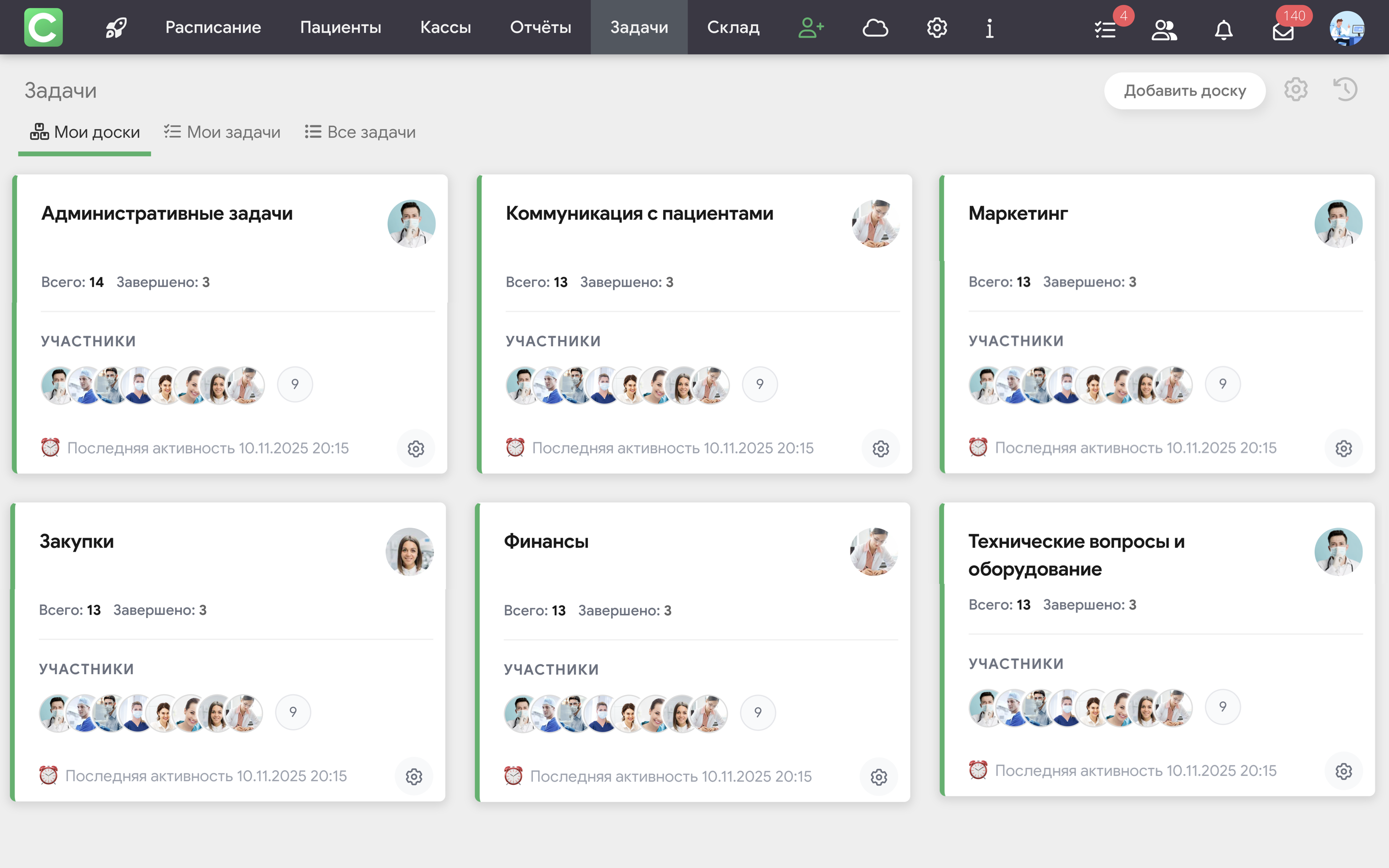Эти доски являются тестовыми, как и все задачи и комментарии в них. Они созданы для демонстрации того, как может выглядеть работа с Задачами в реальной клинике.