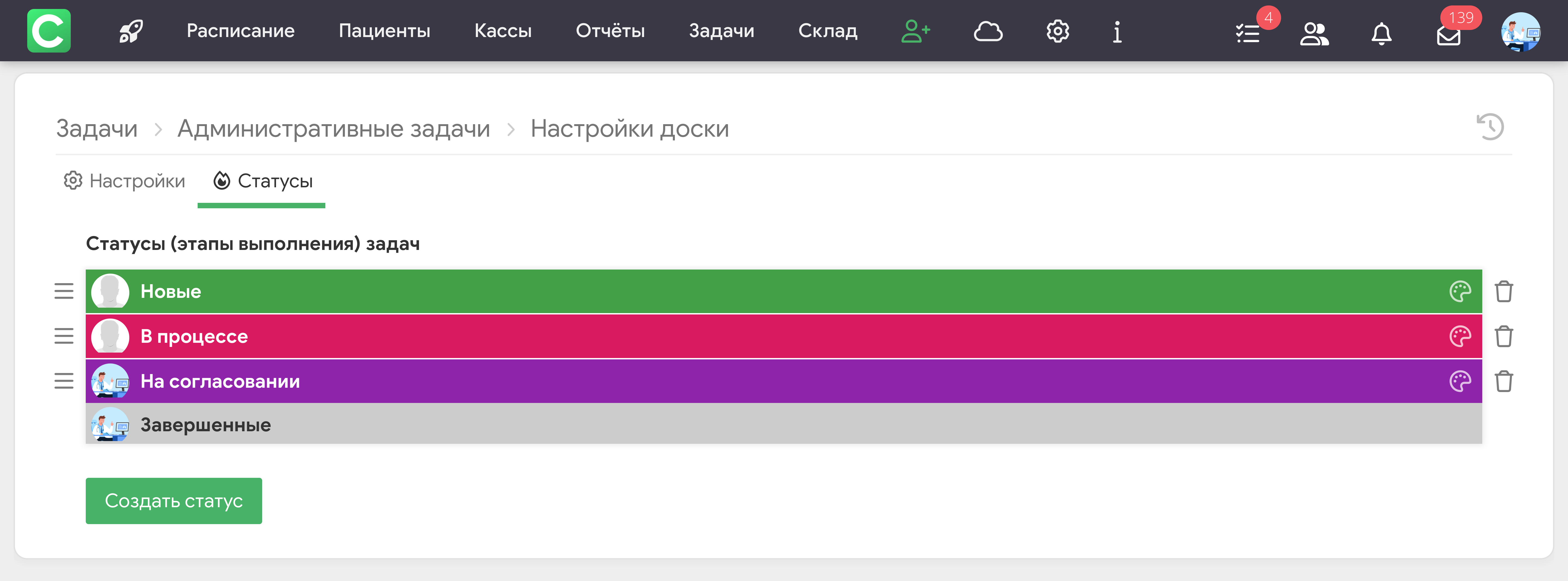 Чтобы начать работу с Задачами, модуль нужно активировать в настройках клиники.