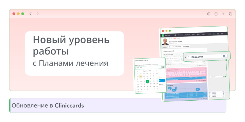 Планы лечения в Cliniccards стали ещё более практичными. Теперь вы можете не просто сформировать план, а сразу запланировать конкретные манипуляции на следующий визит с выбором даты.