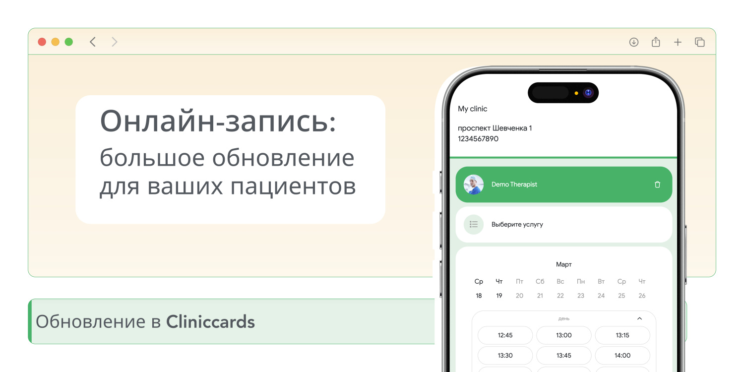 Теперь онлайн-запись в Cliniccards еще эффективнее: быстро, понятно, без лишних вопросов. Пациент получает удобство, вы — больше записей и меньше рутины.