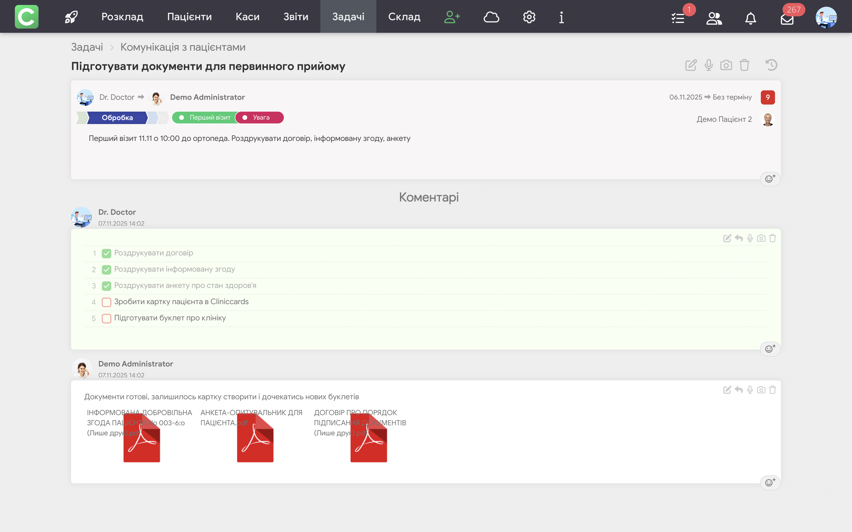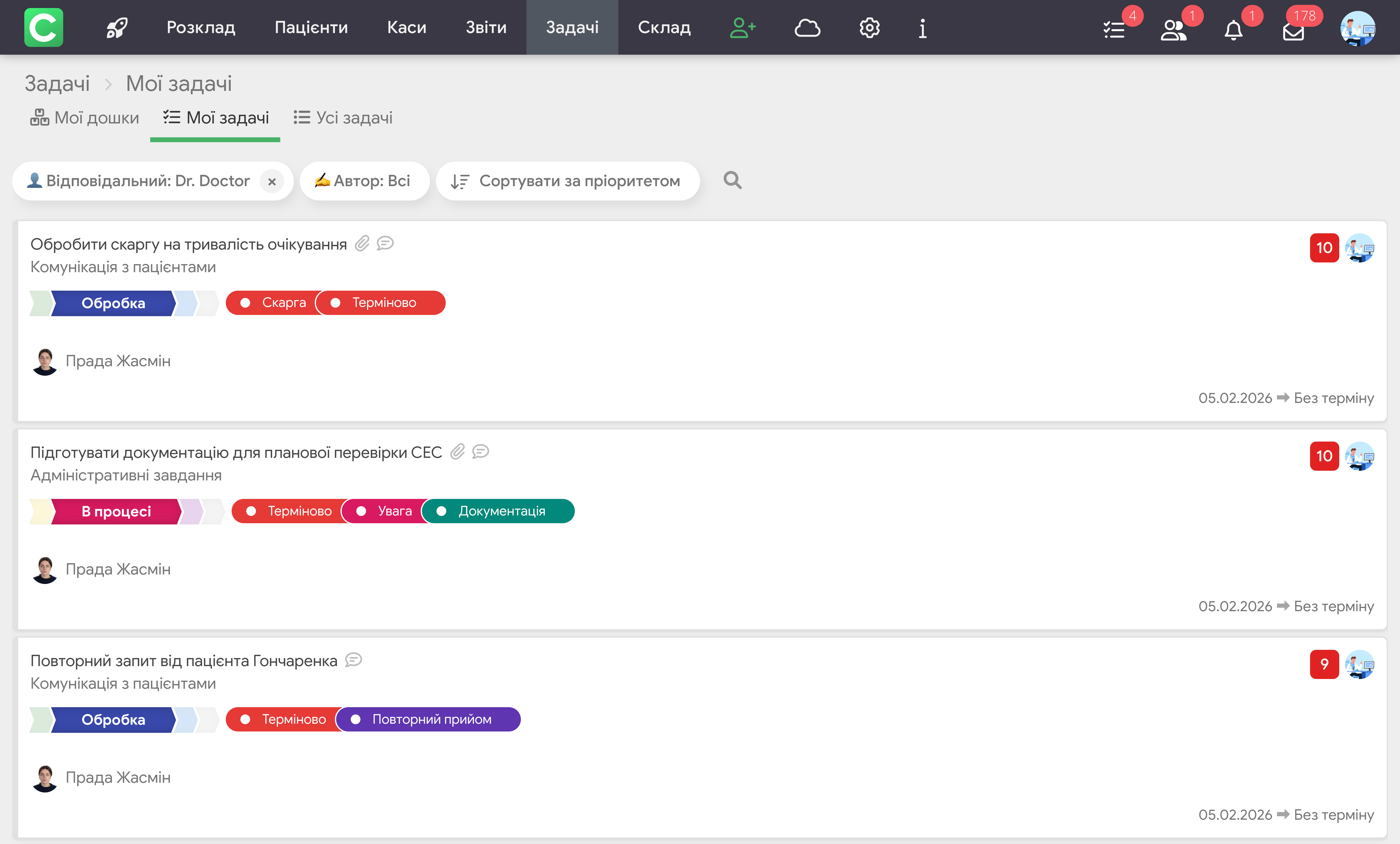 Це дозволяє не пропускати важливі дії в задачах і швидко переходити між клініками без ручного перемикання.