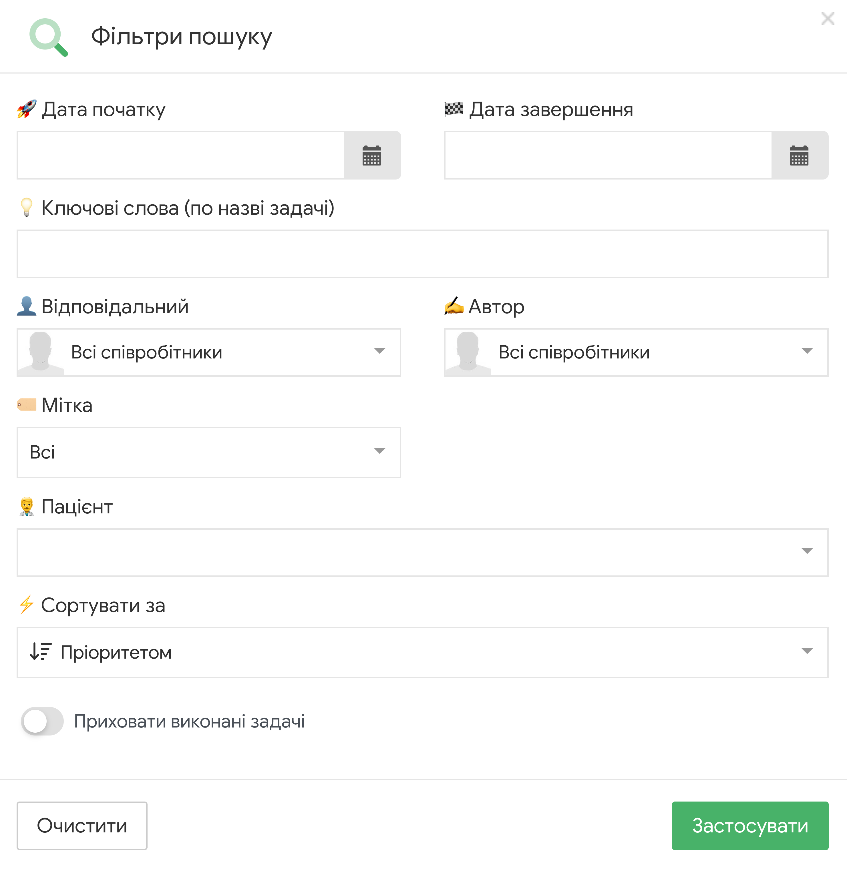 Результати можна сортувати за пріоритетом (від високого до низького), датою створення та датою початку/завершення.