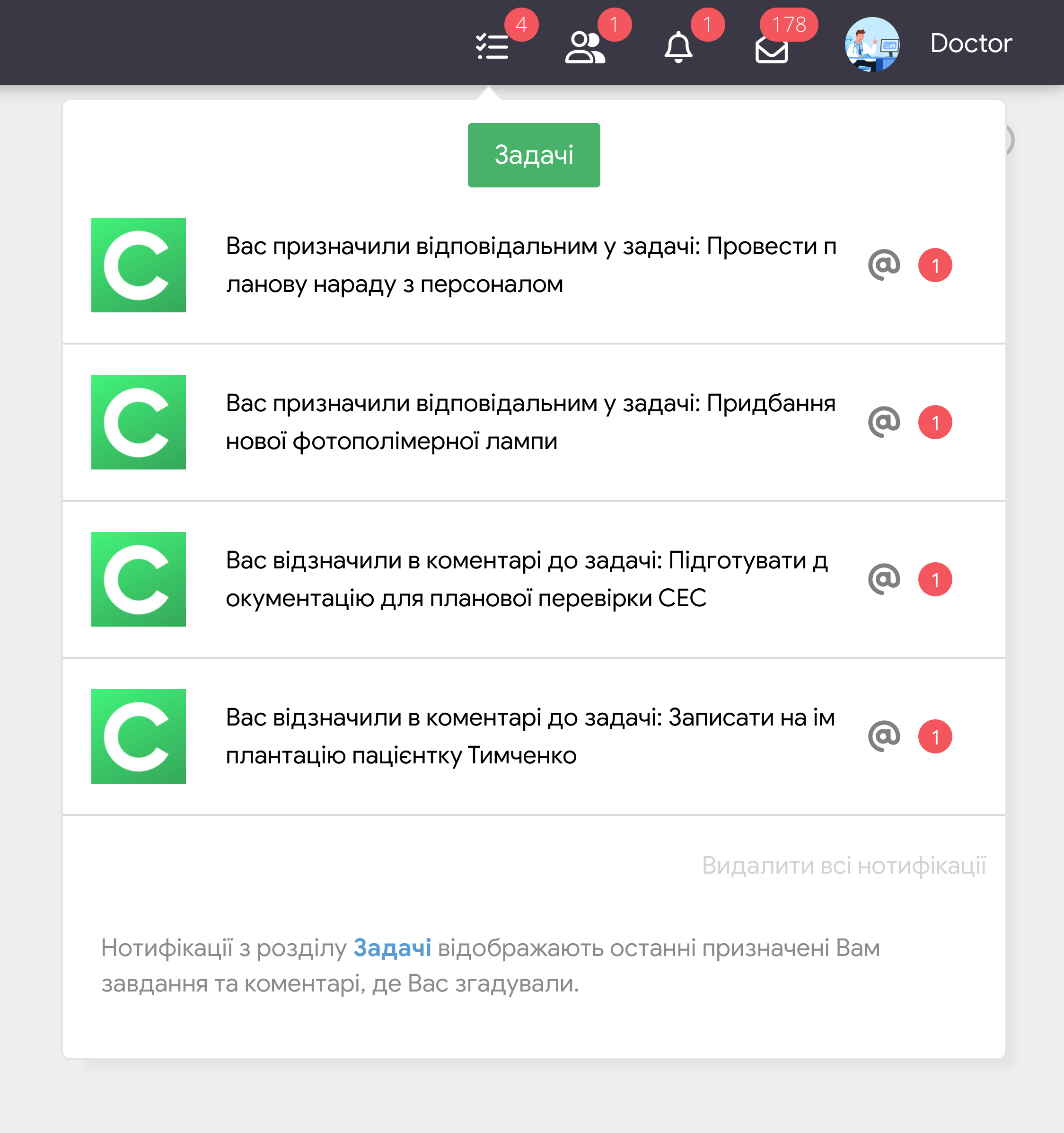 Важливо: тут відображаються нотифікації з усіх клінік, у яких користувач є учасником і де активований модуль Задачі. Тобто, якщо ви працюєте з кількома клініками – всі повідомлення з їхніх задач збираються в одному місці.