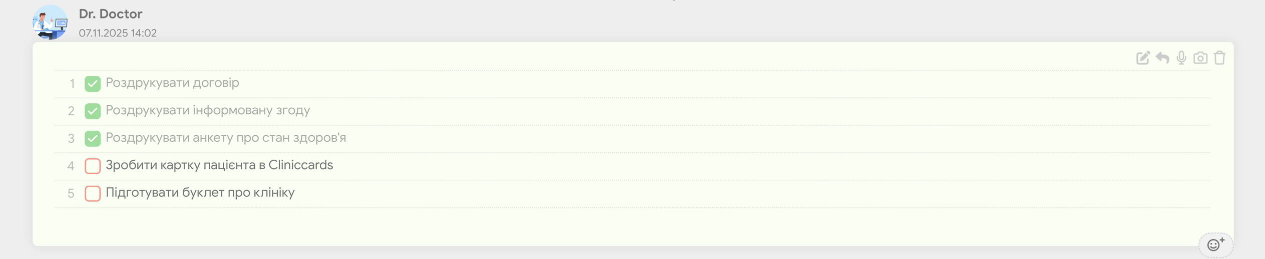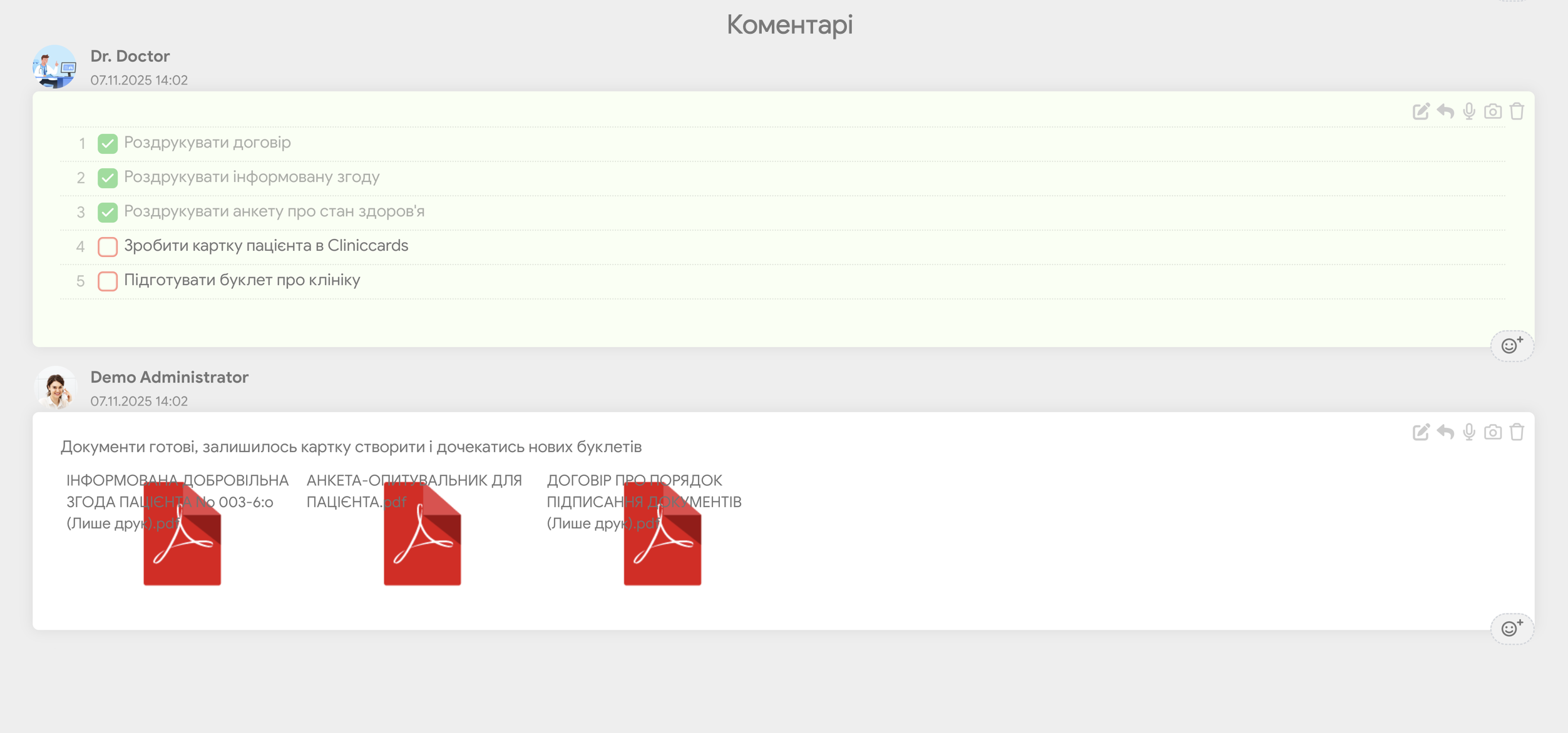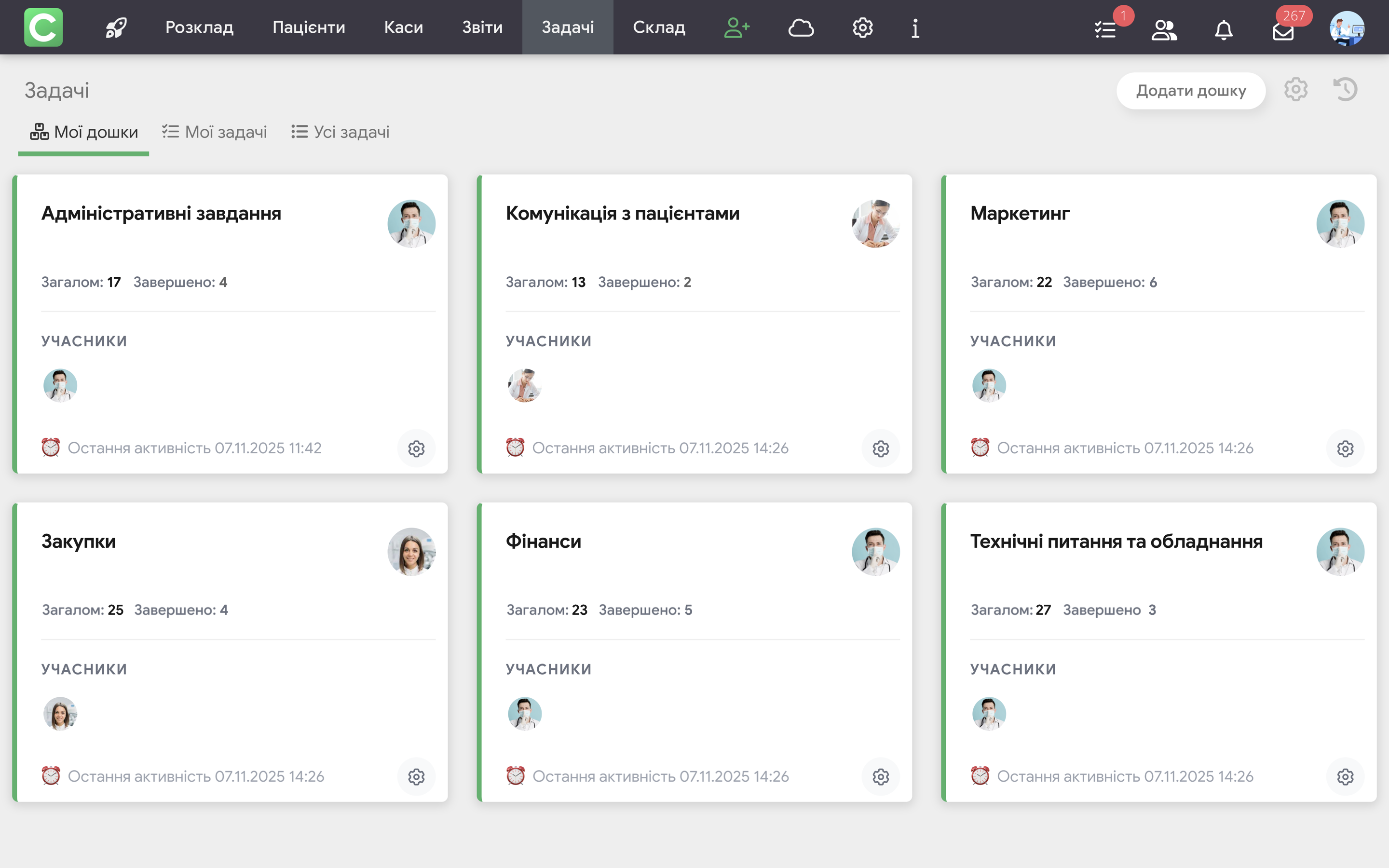 Ці дошки є тестовими, як і всі задачі та коментарі в них. Вони створені для демонстрації того, як може виглядати робота з Задачами у реальній клініці.