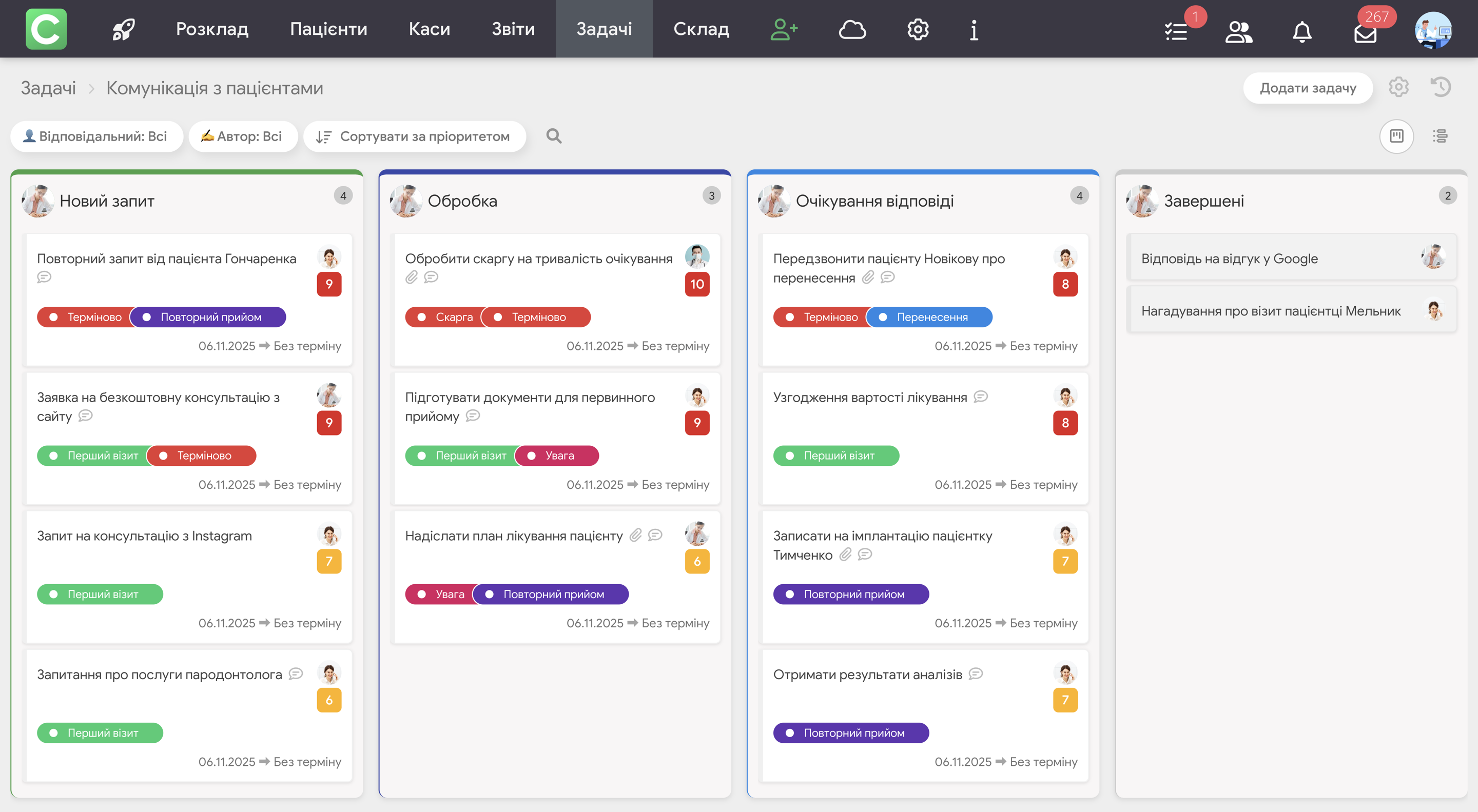 Модуль Задачі дозволяє планувати, розподіляти та контролювати всі робочі процеси в клініці або лабораторії.